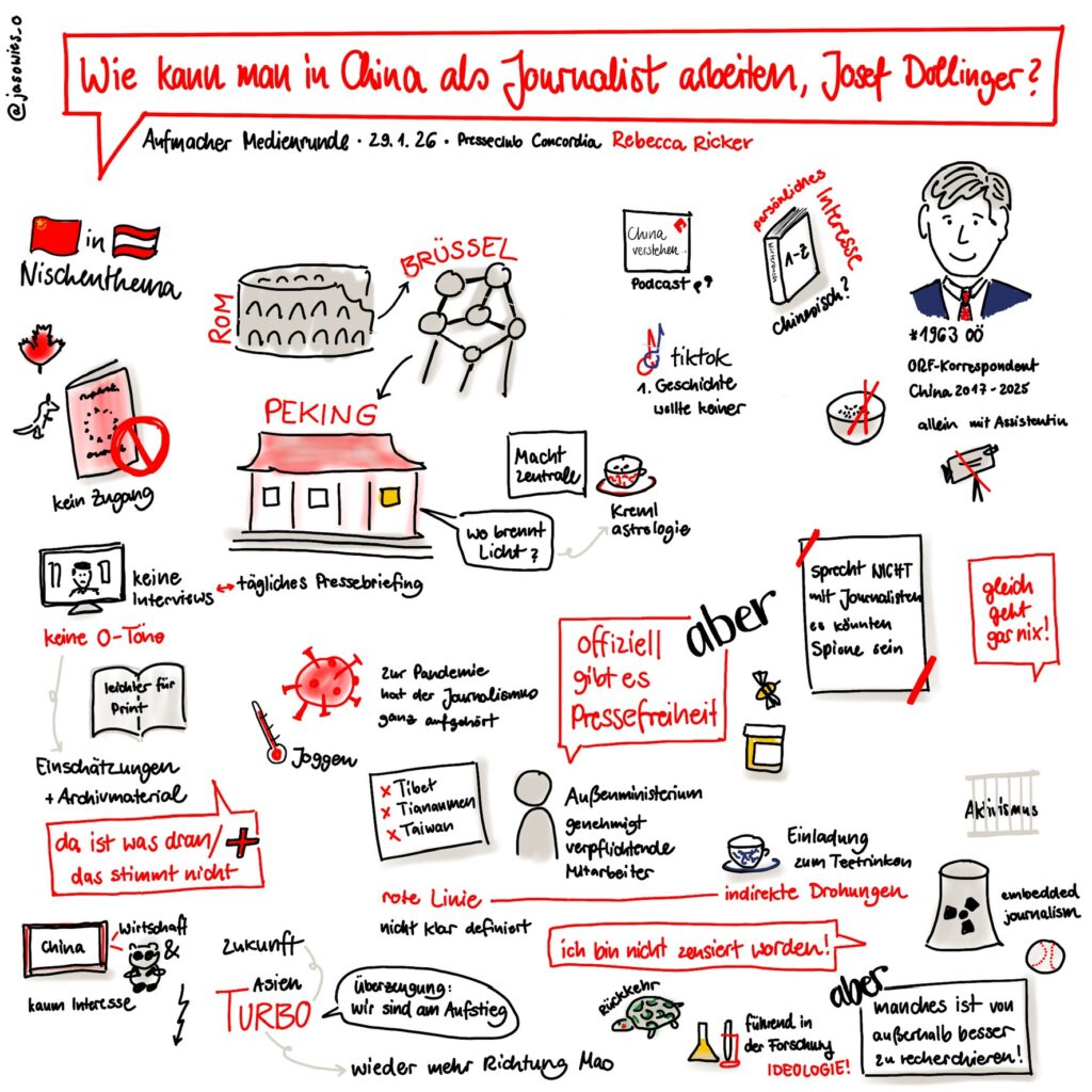 Deshalb war ich heute bei der Aufmacher Medienrunde im Presseclub Concordia, wo Moderatorin Rebecca Ricker fragte: „Wie kann man in China als Journalist arbeiten, Josef Dollinger?“